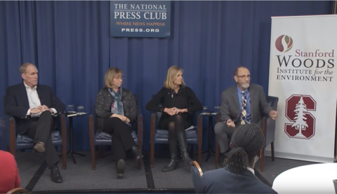 On February 14, experts met in Washington, D.C. for a panel discussion on the recent evidence showing that carbon dioxide emissions are surging after a period of slowed growth. Serving as moderator, Chris Field, Perry L. McCarty Director of the Stanford Woods Institute for the Environment and former director of Working Group II of the IPCC, led the discussion. Panelists included Stanford Earth Professor Sally Benson, co-director of the Precourt Institute for Energy and director of the Global Climate and Energy Project; Stanford Earth Professor Rob Jackson, chair of the Global Carbon Project; and Sheila Bonini, senior vice president of private sector engagement at World Wildlife Fund. The panel focused on the major causes behind the shift in the global emissions trajectory, implications for reaching the target in the Paris Agreement, and where efforts should be concentrated to generate future emissions reductions.