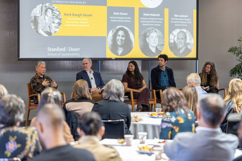 Baugh-Sasaki, Kumar, and a panel of Stanford artists and scientists came together with community members on October 30 to discuss the artwork and the creative intersections of science and art for sustainability during the 20th anniversary celebration of the Stanford Woods Institute for the Environment.