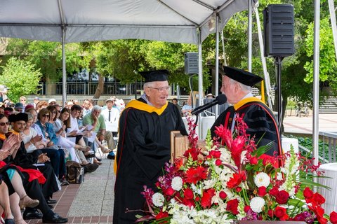 On June 17, 2018, a full 70 years after graduating with his master’s degree, Funkhouser again donned a cap and gown for Stanford Earth’s diploma ceremony, where he was presented with the school’s Distinguished Alumni Award for his contributions to science and his leadership in the field of petroleum geology. The award recognizes highly significant, long-lasting contributions to the civil, government, business, or academic communities by members of the school’s alumni body.