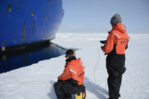 Hidden from view, other microalgae eke out an existence within and under the floating ice. “There are communities of ice algae that bloom and turn the whole bottom of the ice green, and they begin the process for everything that grows during early spring and throughout the summer,” said Ali Palm, a student in the Stanford Doerr School of Sustainability’s Earth Systems Program who is developing an honors thesis from her work on the Sikuliaq this summer.